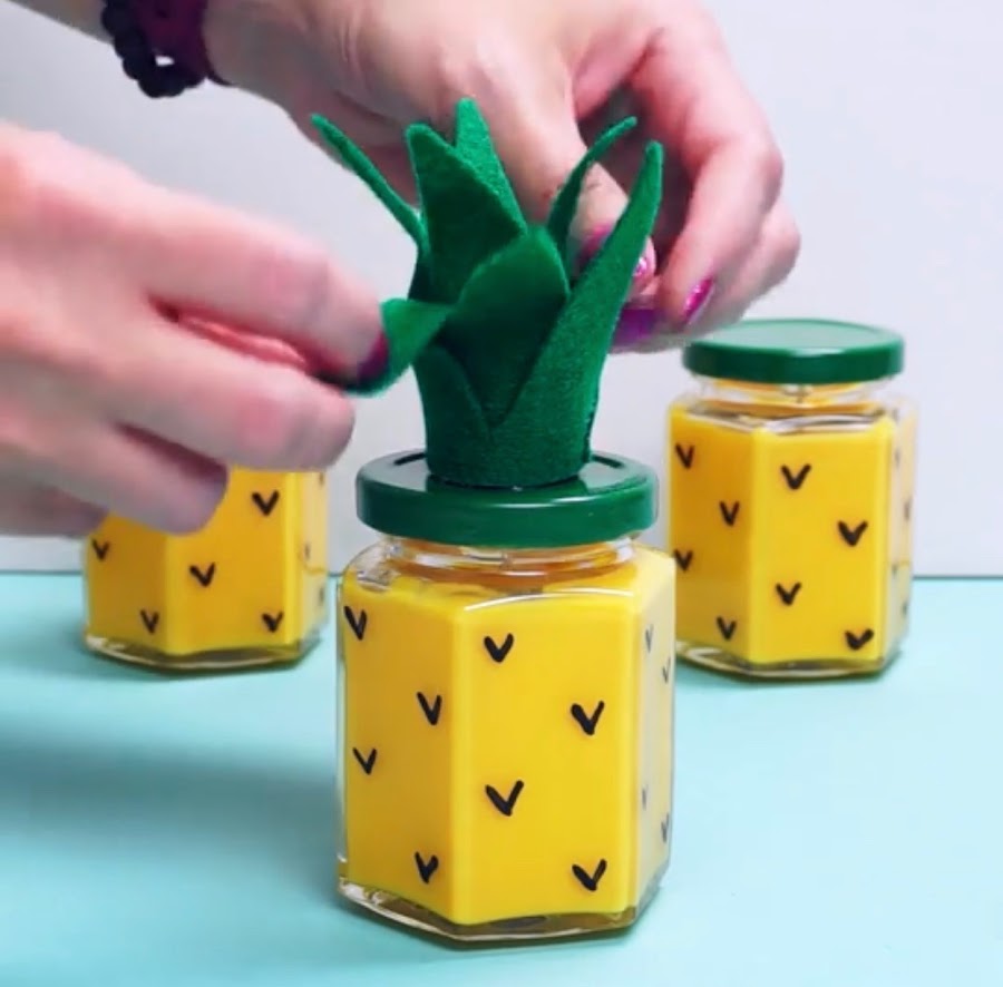 Mientras las velas se están enfriando, aprovecha para pintar las tapas de los frascos de color verde. Corta y ensambla las hojas fabricadas con fieltro.