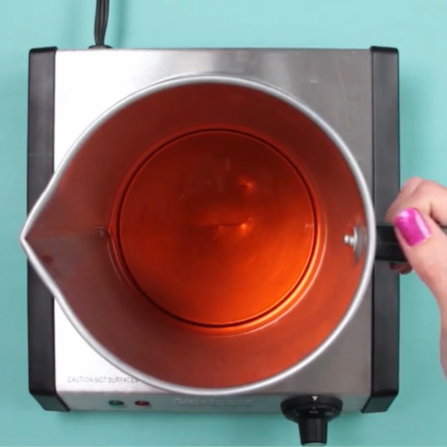 En la jarra especial para derretir velas, a fuego medio-bajo, derrite cuatro tazas de copos de cera de soja, revolviendo con frecuencia.