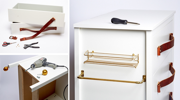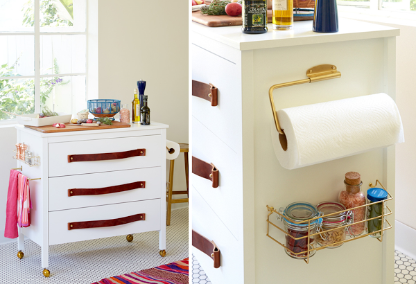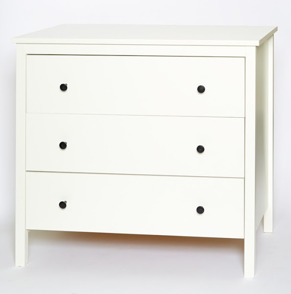 Volvemos a recurrir a un mueble de Ikea, en esta ocasión la cómoda Hemnes de tres cajones. De nuevo colocamos cuatro ruedas en la base de las patas y sustituimos los pomos originales del mueble por tiradores de cuero aprovechando los orificios antiguos.