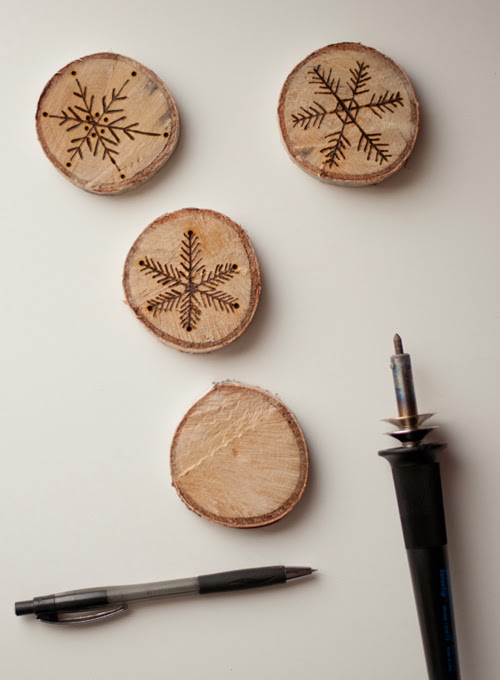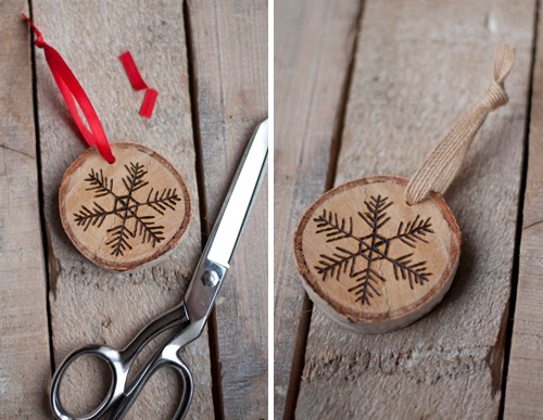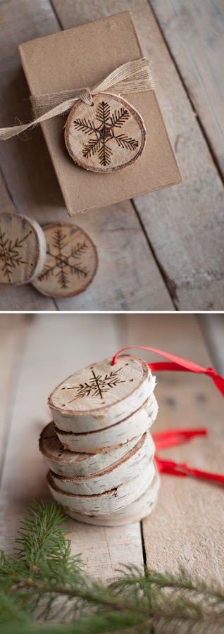 La madera de los árboles de abedul son una maravilla para realizar adornos navideños grabados. En combinación con un trozo de cinta o cuerda y una rama de abeto o dos, conseguirás con estos pequeños adornos dar a tu casa un estilo rústico.