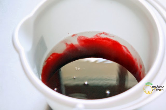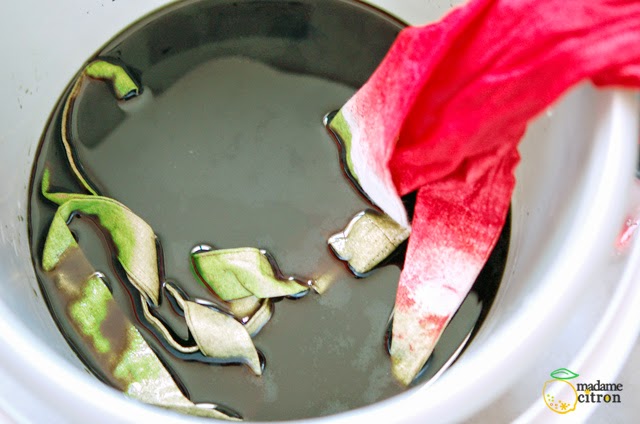 Primero diluimos el tinte rojo en un recipiente con agua e introducimos la parte inferior de la bolsa 20 minutos.