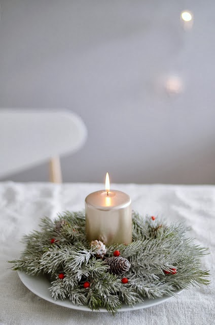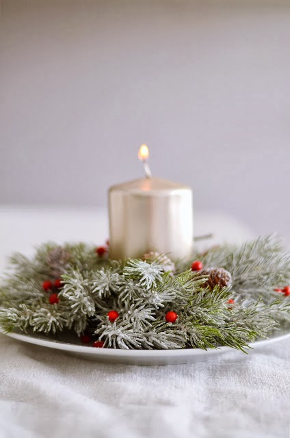 Aquí está mi tercer post de hoy, un centro para la mesa de Navidad que no puede ser mas sencillo. Un plato de loza blanco, una vela gruesa, piñas, bayas, y ramas de abeto es lo único que necesitas para crear este centro de mesa para Navidad. Si prefieres puedes rociar las ramas de abeto y piñas con pintura en spray tipo nieve para lograr un acabado mas invernal. Vía ................si te ha gusta ...