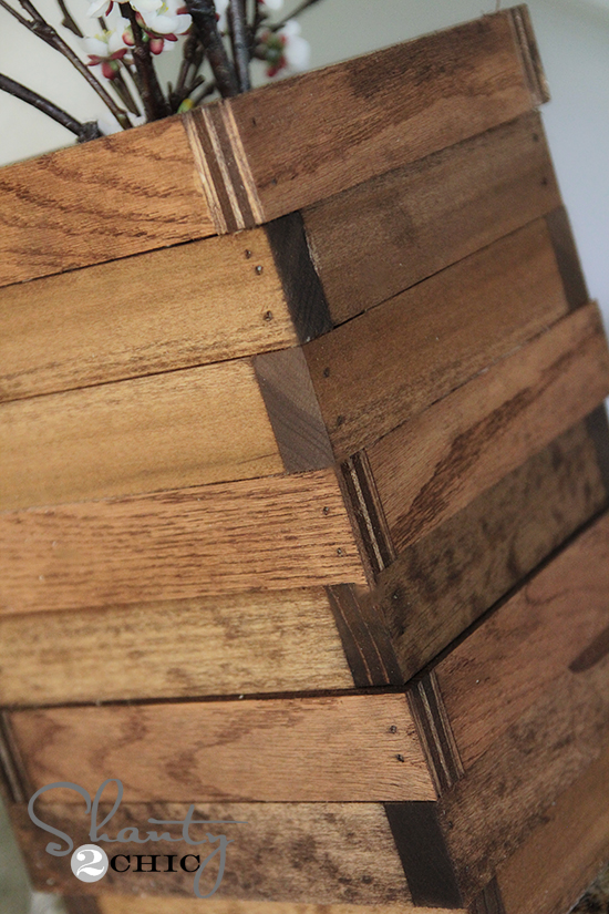 Este jarrón de madera esta realizado a partir de 32 tablas de madera de de 20x5x2cms. Lo primero es realizar cuadrados uniendo las tablas con clavos, no necesitas que sean todos perfectamente iguales, así le darás un aspecto mas rustico al jarrón. Luego colocas los 8 cuadrados uno encima de otro uniéndolos una vez mas con clavos, estos no te molestes en taparlos. Y por último barnizas el conjunto e introduces dentro un tiesto o botella con flores.