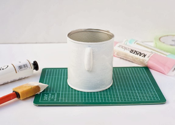4.-Si queremos pintarlo a dos tonos pondremos cinta de pintor alrededor del perímetro de la parte inferior de la lata. ( Si preferís adornarlo con cinta washi-tape no hace falta que pongáis la cinta ).