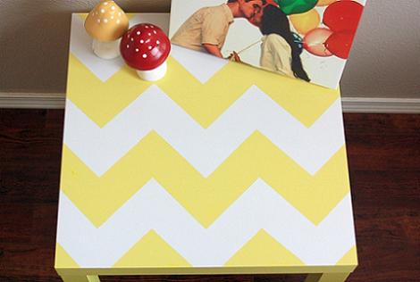 Después conecta los puntos con la cinta de enmascarar, tal y como vemos en la segunda foto de debajo. Lo que está cubierto con la cinta quedará amarillo y lo que ahora vemos amarillo quedará pintado de blanco. Tapa con la cinta también los laterales de la mesa.Ya solo queda pintar el espacio que no está cubierto, aplicando la pintura en spray, y dejando secar entre capas. ¡Retira la cinta de enmascarar y ya tienes una preciosa mesa Lack con zig-zag!