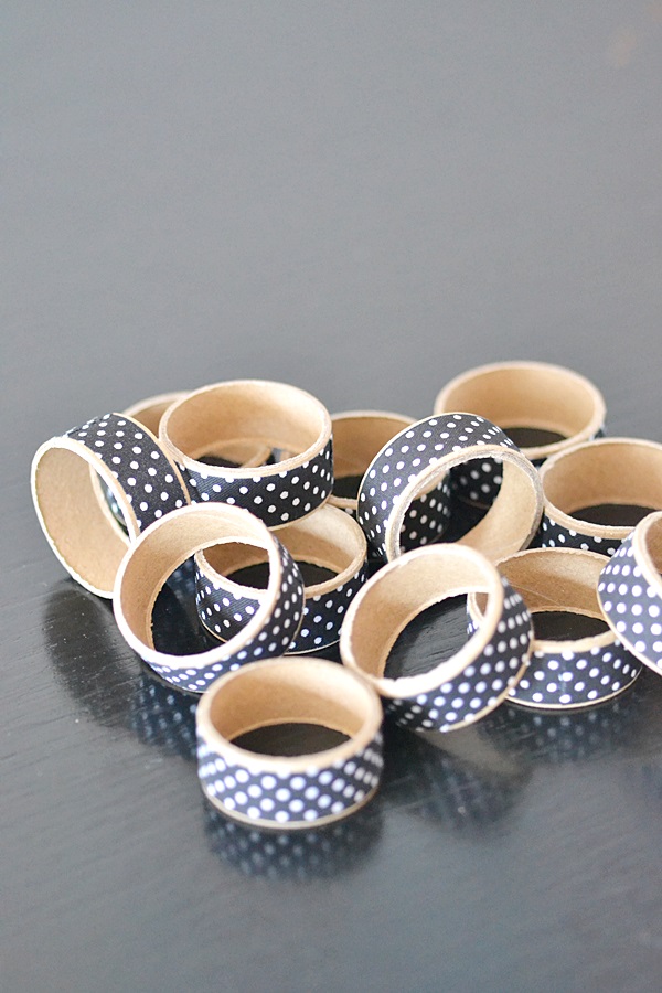 Unos servilleteros para una fiesta realizados con unos rollos de cartón cortados y cinta washi tape. Sencillos y bonitos ¿No crees?