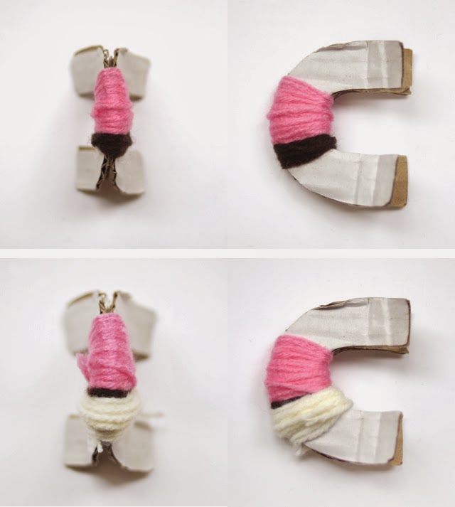 Recortas cuatro cartones en forma de herradura, (ten en cuenta que la lana solo la colocaras alrededor de semicirculo, no en la parte recta de la plantilla).