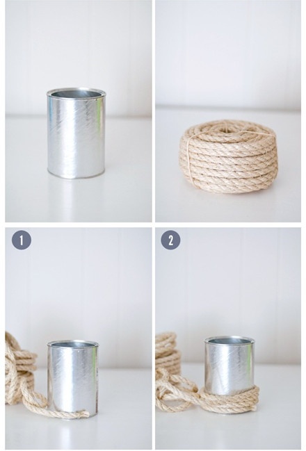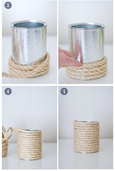 Realizarlo es tan sencillo como cubrir de pegamento la lata?.Ir enrroscando la cuerda teniendo cuidado para que quede bien apretada y sin espacio entre cuerda y cuerda.