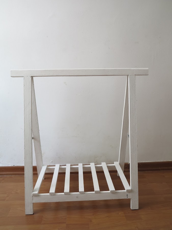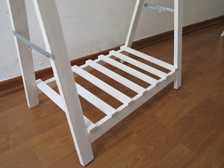 Por mucho que me gustaran lo siento, pero ¡NO! Por lo que se me ocurrió, comprar dos caballetes normales y ponerle yo los listones ¿Cómo? muy sencillo. Cortamos los listones con la medida que hay entre la separación de los caballetes, lo lijamos todo, listones y caballetes y pintamos con el color deseado, así de sencillo.