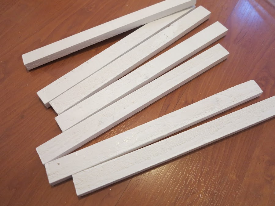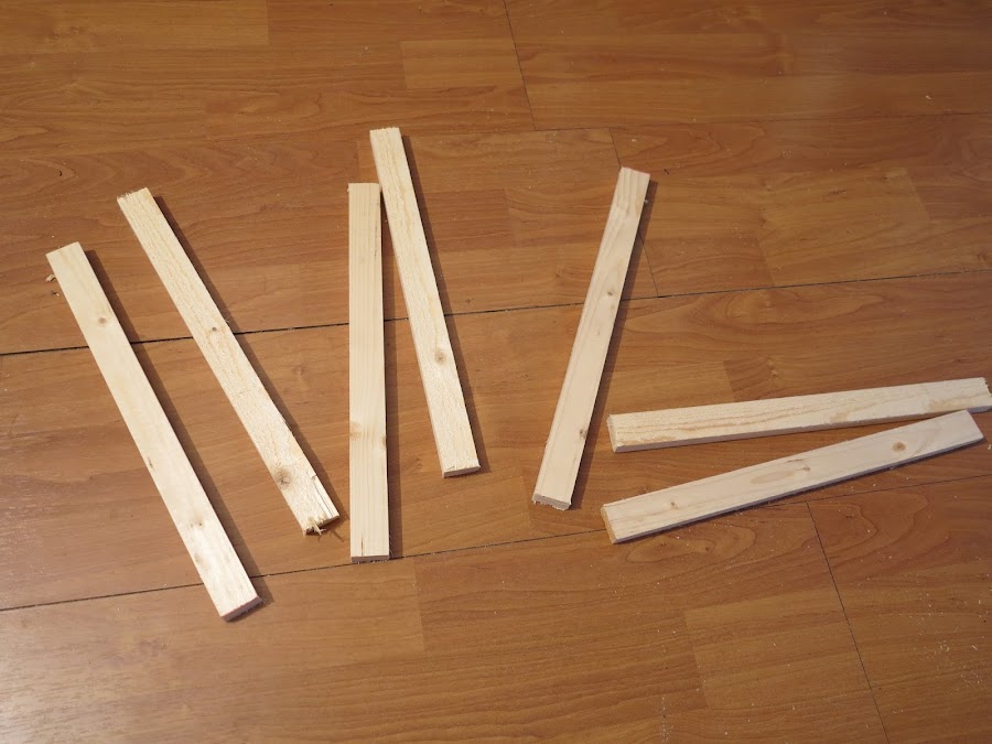 Una vez todo seco, calculamos la separación entre cada listón para que sea todo simétrico, pegamos con cola para madera y colocamos un poco de peso encima para que haga buen contacto.