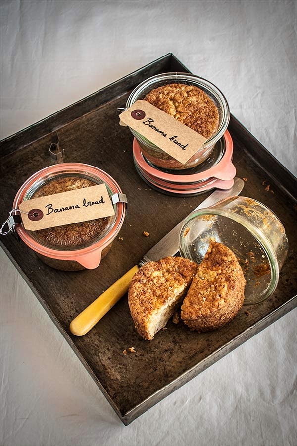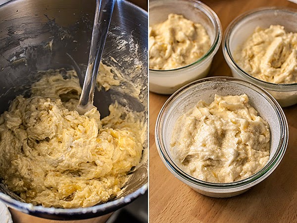 Untamos de mantequilla los tarros elegidos como cualquier otro molde de bizcocho, y enharinamos, eliminando la harina sobrante. Vertemos la masa en los tarros hasta unas 3/4 partes de la altura y los metemos en el horno. Cocemos los bizcochos 30-35 minutos; probamos con una brocheta si están hechos.