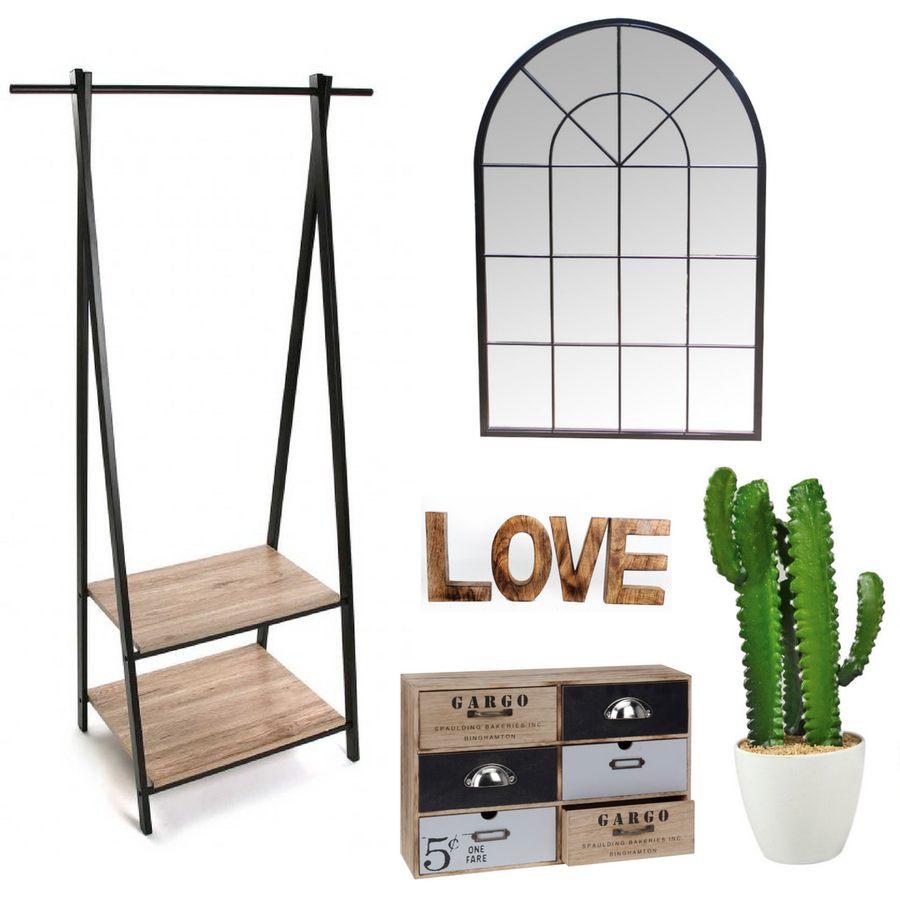 Madera y metal para seguir una de las tendencias del momento. Esta vez, el protagonismo lo tiene este burro ideal para dejar los abrigos y los zapatos. Con un espejo como este conseguirás la sensación de añadir una ventana a tu recibidor con el que duplicarás la luz. Resta frialdad a la decoración con alguna planta, como por ejemplo este cactus artificial.