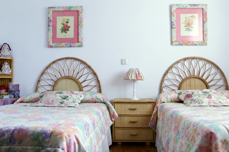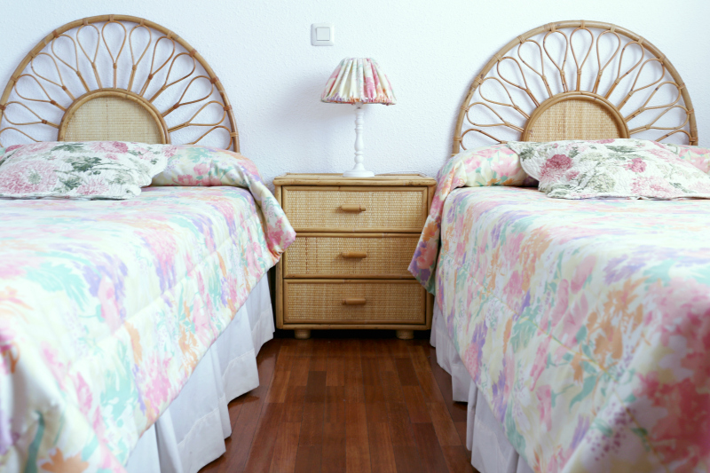Un cojín de estampado de peonías, a juego con los de las camas, le da un