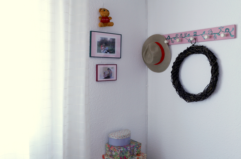 La percha rosa y blanca con dibujos de flores la pintó mi hermana hace