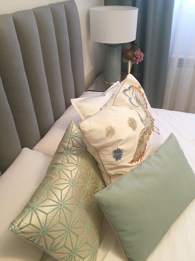 Creo que las mesitas de espejos y la lámpara de techo fueron las primeras en llegar, después hizo la compra de la ropa de cama junto con los cojines, mientras yo me encargaba de las cortinas y de las lámparas de cerámica, además del cabecero, ese lo diseñé especialmente para Alicia seleccionando un lino en color gris claro, proporcionando a mi tapicero las medidas adecuadas del ancho y alto, así como la separación entre costura y costura en vertical.