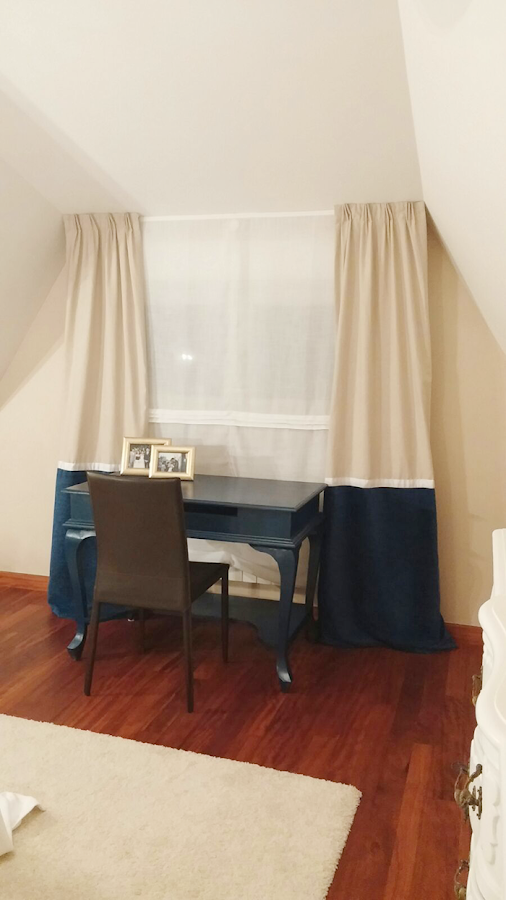 Me he reído porque hay hasta dibujos de cómo hacer las cortinas, yo lo dibujo se lo explico y ella lo hace! Cortinas, pues se pone a coser las cortinas, estor, pues ahora toca coser el estor, cambiar el color del escritorio, venga!! Compra la pintura y lo pinta. Pero lo más impresionante es como ha transformado una cómoda de segunda mano, aprovechando el espejo, el marco y toooooooo!!!