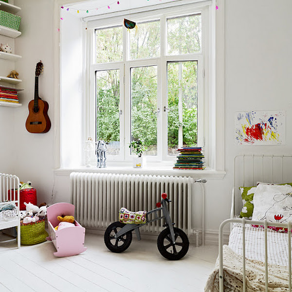 Este cuarto es una verdadera maravilla en lo que a decoración ecléctica se refiere, mezcla elementos antiguos, piezas recicladas, low cost y además cumple perfectamente con una luz natural increíble, una zona de juego y dos zonas independientes para cada niño.