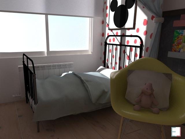 Fuimos a visitar la casa, tomamos medidas y charlamos un poco sobre preferencias y gustos. Tanto de los padres, como de la pequeña, que tenía adoración por Mickey Mouse. De ahí el guiño en el papel pintado rojo de lunares y un cuadro sencillo que fácilmente puede sustituirse en el futuro.