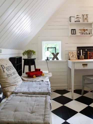 El estilo vintage lo trasladamos hoy a este dormitorio juvenil. Una cama de forja, textiles de lino en colores adecuados y unas maletas usadas se encargan de dar a esta estancia un precioso aire vintage. La escalera a modo de estantería y las letras decorativas envejecidas dan el toque final al conjunto.