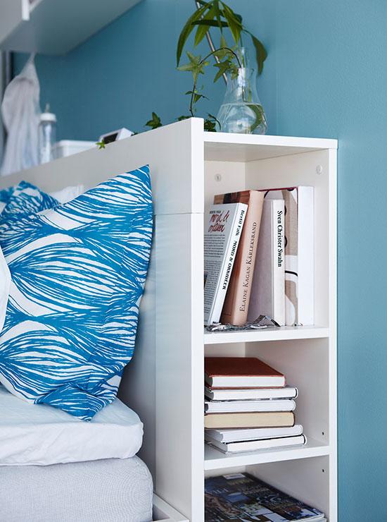 Fuente: Ikea Además de buscar mesillas estrechas que ocupen poco espacio (las hay hasta de 30 cm de ancho), puedes optar por una estructura de cabecero que integre las mesillas.