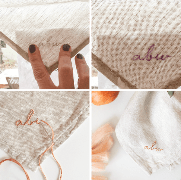 1.- Servilleta bordada: El paso a paso lo encontrarás en el blog flaxandtwine, es muy sencillo! imprime el nombre en un papel con una letra bonita (si tienes una buena caligrafía o sabes lettering ya sería lo más). A través de una ventana copia la letra en la servilleta, por último sólo te falta bordar el nombre con el color de hilo que más te guste.