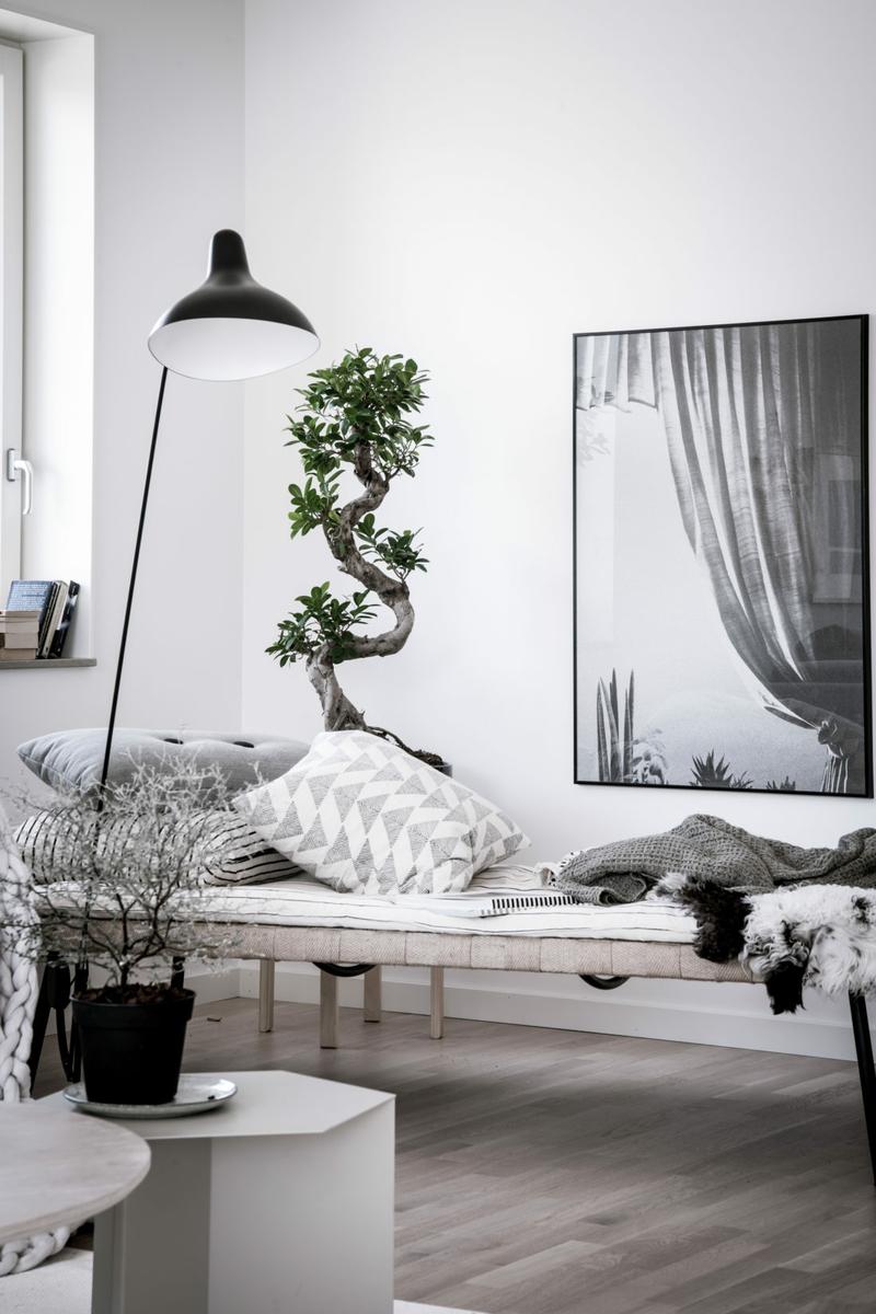 La paleta combina blancos y negros con tonos de gris combinados con madera clara como el Haya natural. Textiles también naturales con escasos estampados, lana, algodón y lino en la misma paleta de colores. La decoración de pared, también sigue el patrón del blanco y negro. No pueden faltar algunos toques de color con plantas altas para completar el interiorismo.