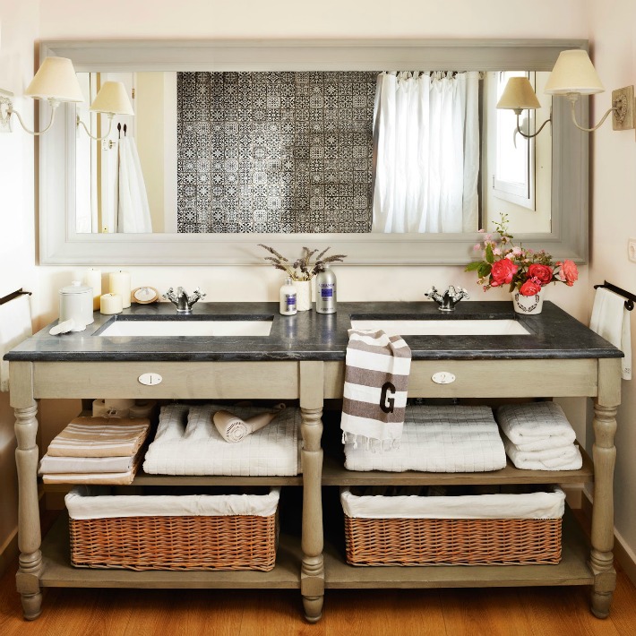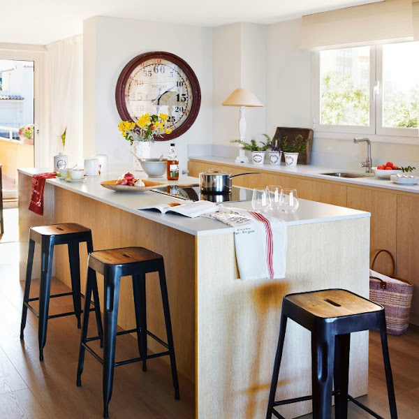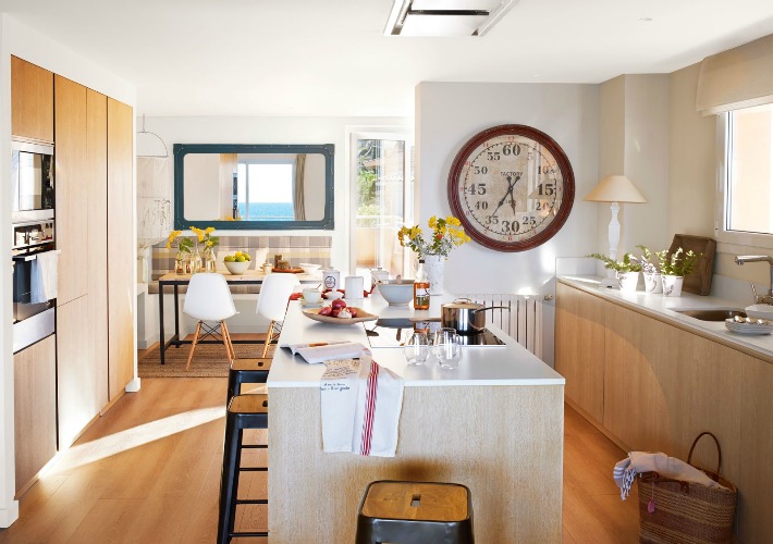 En la cocina todo está pensado para que se integre bien en la decoración: los muebles no tienen tiradores, la campana está encastrada en el techo y no hay módulos altos. Detrás de la isla central, toda la pared es un armario hasta el techo que ofrece almacenaje y esconde la nevera, la lavadora y la secadora. Y la península sirve de barra de desayunos o para tomar el aperitivo con amigos.