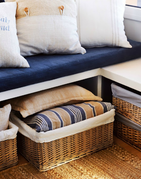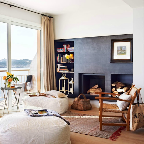 El espacio central de la zona living está protagonizado por los sofás y dos bancos de obra bajo las ventanas. Bancos que se han aprovechado para construir una práctica zona de almacenaje bajo ellos.