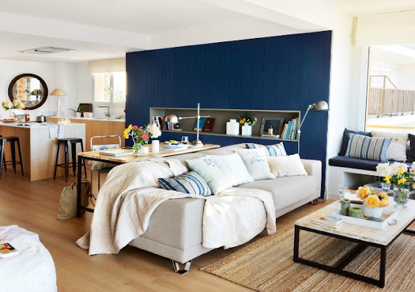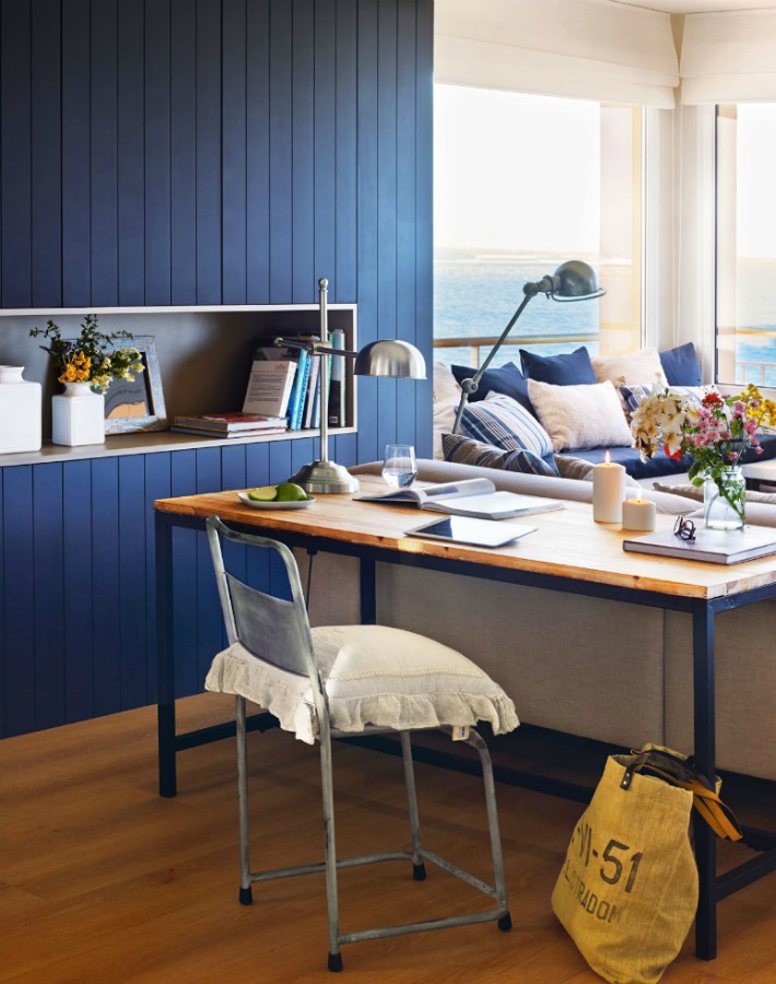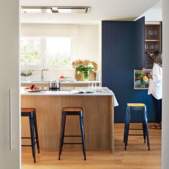 Camino a la cocina nos encontramos con unos paneles de DM azul marino que delimitan el comedor y el estudio responden al deseo de los propietarios de darle al piso un aire marinero y acogedor, además de práctico.