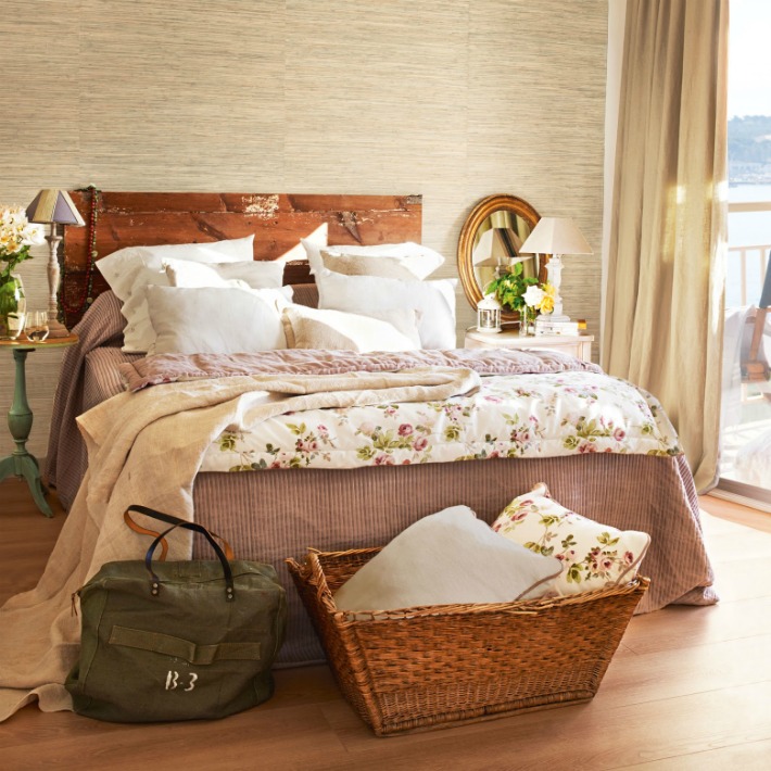 En el dormitorio principal no faltan guiños al estilo rústico y mediterráneo que pidieron los propietarios. Una butaca de madera y enea, alfombras de fibra vegetal y el papel pintado del dormitorio que simula cañitas y contrasta con el armario blanco.