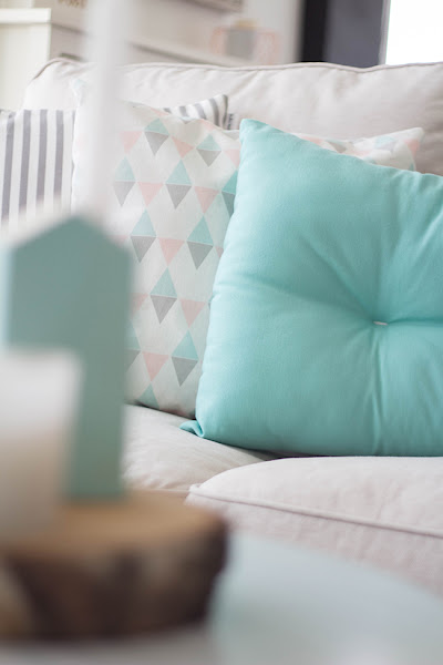 Mint, rosa y gris como colores principales. Par el sofá cojines cómodos y mullidos, ideales para las largas siestas de los domingos y mezclados con los ya antiguos rayas y estrellas, yo soy bastante de básicos porque son muy fáciles e combinar en cualquier época del año.