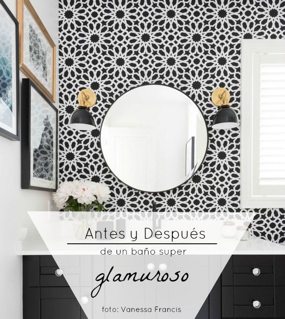 Si te fijas hay claves en esta decoración que pueden pasar inadvertidas pero que sin ellas esta reforma no hubiera sido igual. Te las chivo para que no se te pasen por alto, el espejo redondo, los apliques dorados, la grifería negra, elegantes marcos...