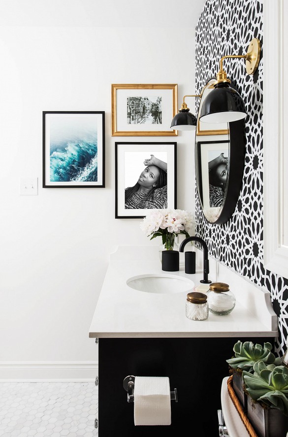 El glamour y la sofisticación reinan en este baño, en el que la combinación del blanco y el negro, salpicada con pequeños toques dorados, le dotan de gran elegancia.