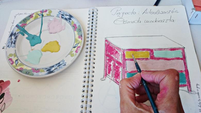 Pasé a hacerle un boceto para que se hiciera una idea de como iba a quedar.Le entusiasmo lo que le proponia .Ella quería que predominara el tono fuxia y de él partimos combinándola con otros colores como el amarillo ,el mint ,el rosa pastel y el turquesa.