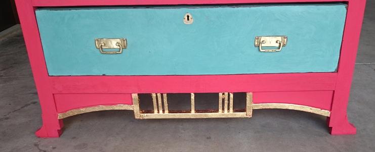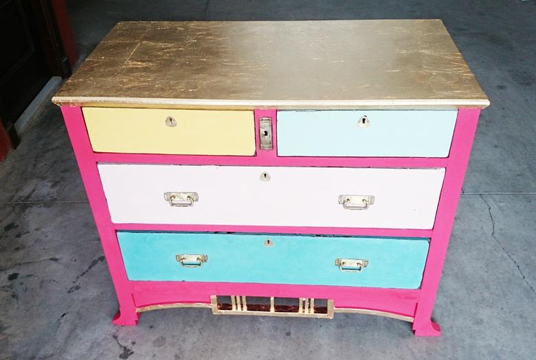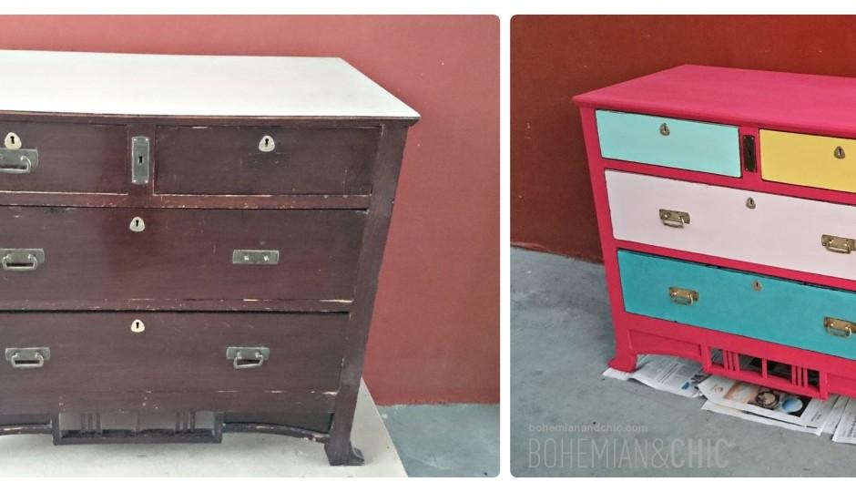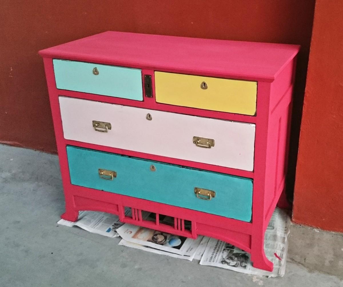 Comenzamos limpiando toda la cómoda,a continuación retiramos los tiradores para devolverles el brillo dorado. Masillamos los desperfectos y sustituimos la tapa de mármol por una de madera. Pintamos la estructura con pintura( Chalk Paint )de fuxia y los cajones en diferentes tonos combinando tonos fríos y calientes.Dando un aire alegre y bohemio a la pieza.Desterrando ese aire anticuado para devolverle a la vida con una segunda oportunidad para que luciera con aire renovado.