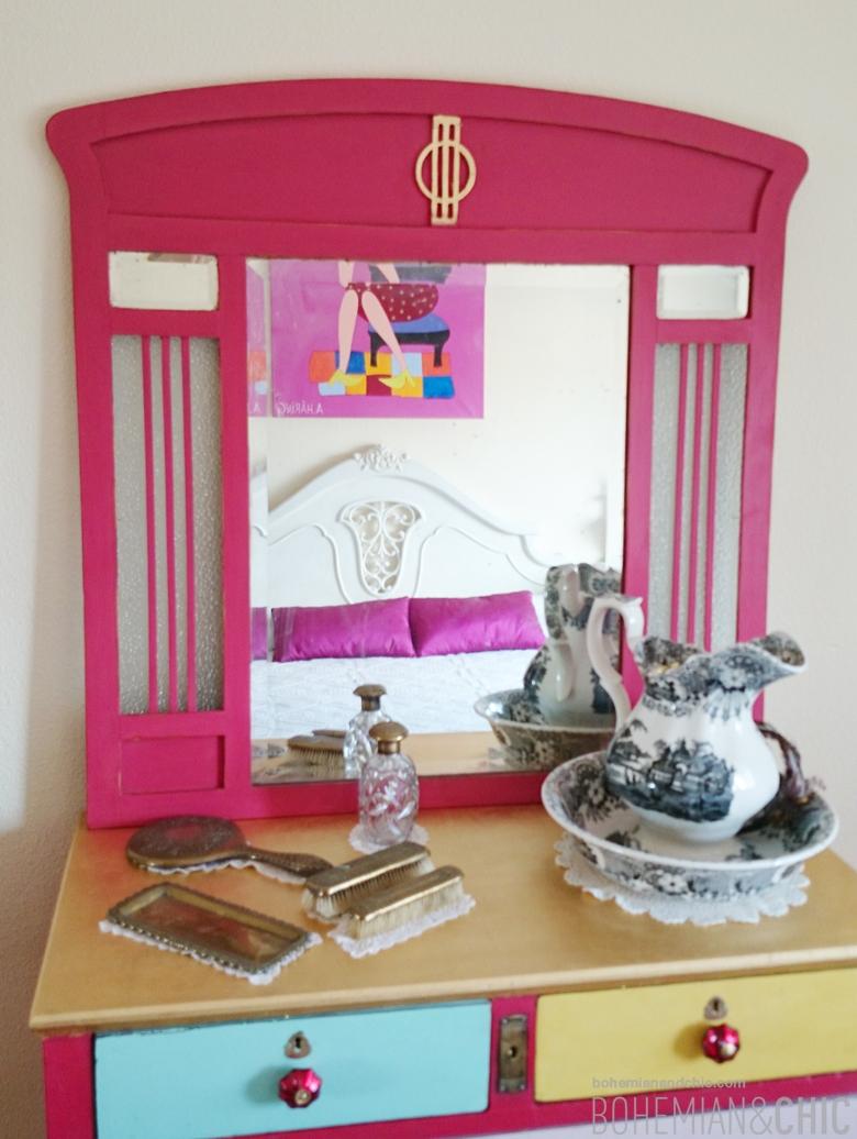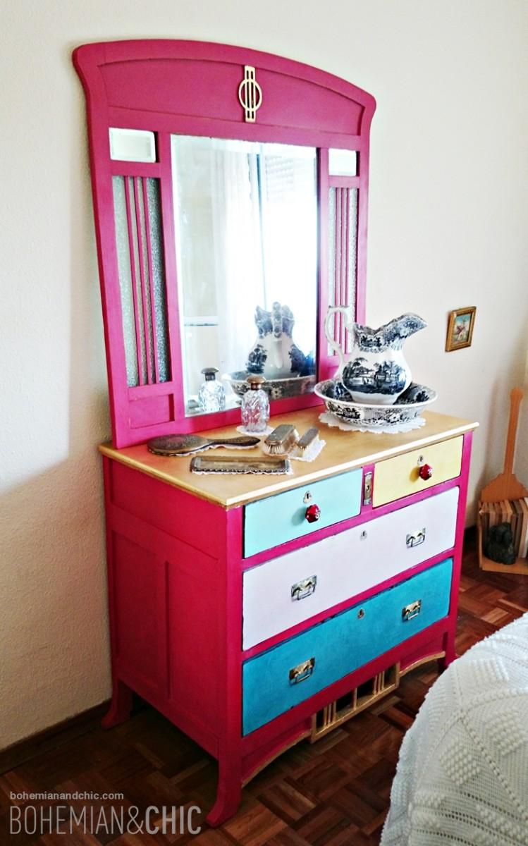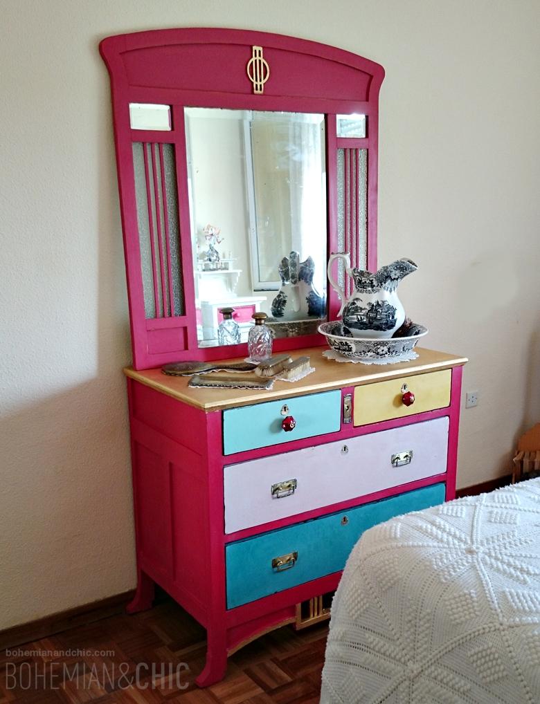 Buenos días!! Hoy para empezar la semana te voy a enseñar como una cómoda antigua la puedes actualizar para darle un nuevo uso en tu dormitorio.Para ello te quiero ilustrar con el antes y el después de una cómoda modernista en tonos alegres y aire bohemio.