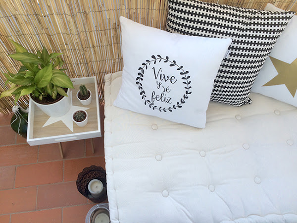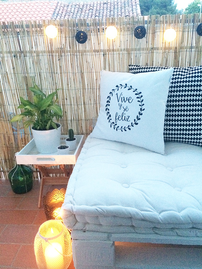 Un día recibí un correo con una idea preciosa, la del mini balcón de Sonia. Ella había usado palets , cojines de Ikea y de la shop con mensajes tan bonitos como el de Vive y Sé feliz (clic aquí) para crear un rincón chill out con muchísimo encanto, negándose a que tener un espacio sin aprovechar en su casa.