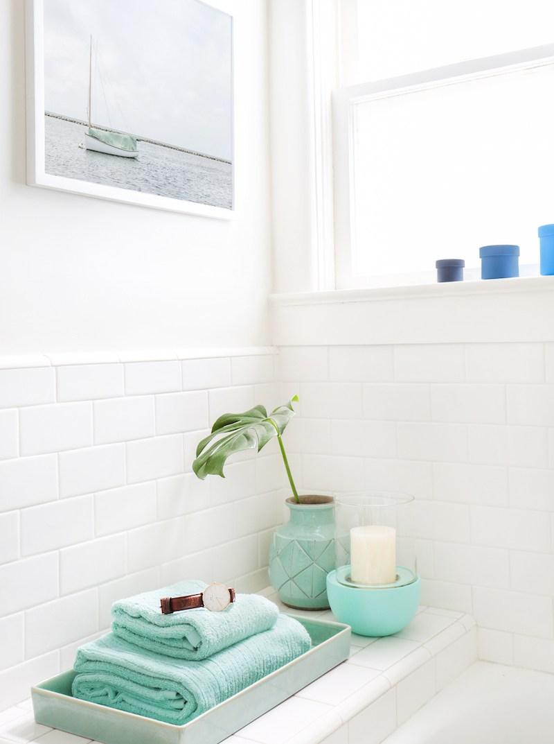 Sobre la encimera del lavabo es preferible dejar suficiente espacio para poder utilizarla. Muchas veces la llenamos de cosas que debemos apartar para poder usarla. Aunque es un recurso encantador decorar con velas, flores o otros objetos, no es buena cosa que ocupen la mayoría del espacio.