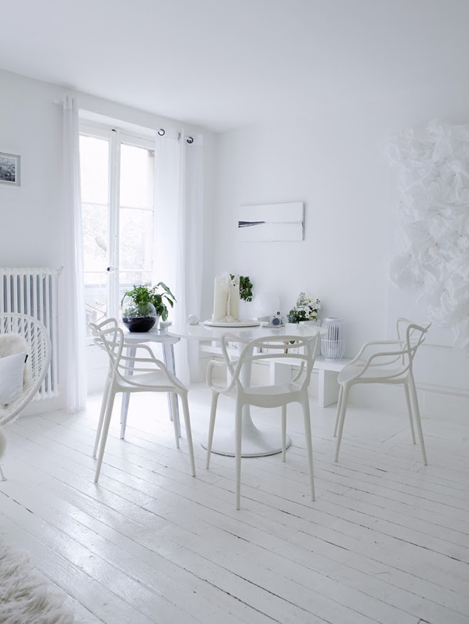 Un rincón de un hogar sin más pretensiones que ser utilizado, elementos que marcan diferencia, un guiño al diseño con las sillas Master y la mesa Tulip, una blancura impoluta y un único punto de color conseguido con la vegetación. Sin más lo tiene todo.