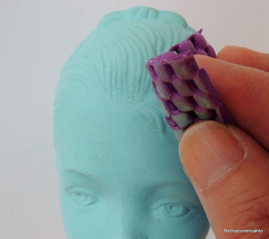 Sí..., con el pincel medio seco dimos unos pequeños brochazos en la diadema y en la lazada, creando algo más de contraste, y la verdad es que nos gustó el resultado.