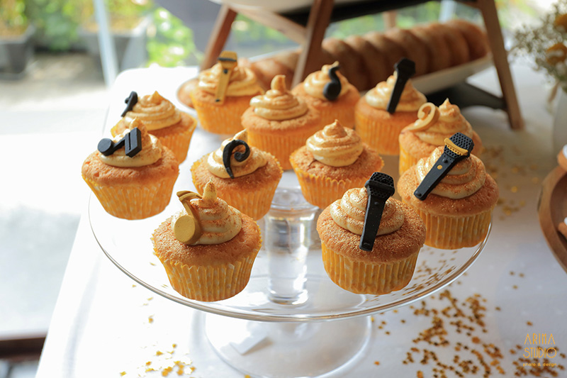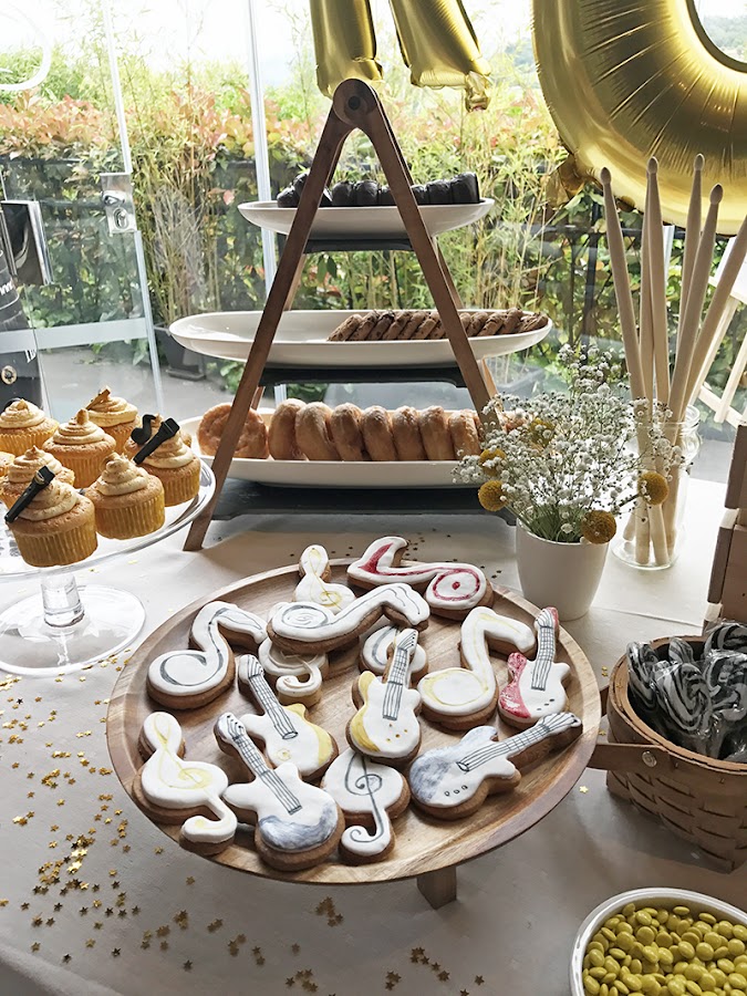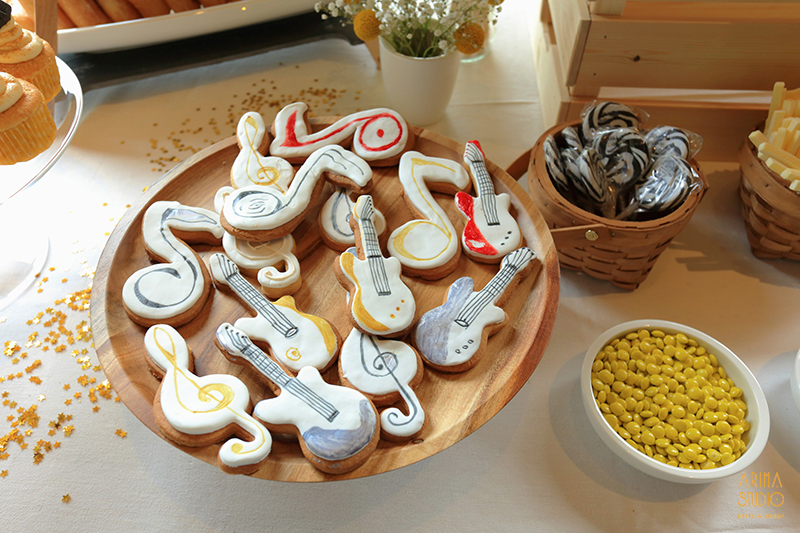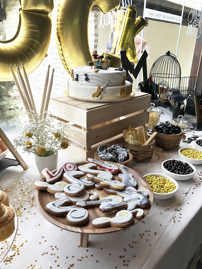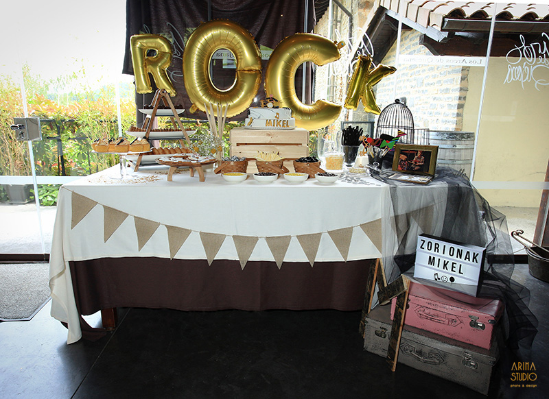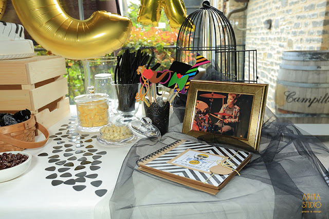 Para decorar la mesa usamos un pequeño centro floral con craspedias y paniculata a juego de las mesas, un libro de firmas handmade, unas baquetas y púas, unas maletas y una lightbox, una letra M con fotos que ya os enseñamos aquí, una marco con la foto del explorador tocando la batería, purpurina de estrellas doradas, una banderola de tela de saco, globos dorados con la palabra ROCK, una jaula de Ikea con velas y tul; y labios, pajaritas y sombreros de cartón, que son perfectas para hacer fotos simpáticas, y llevan color a la mesa ;)