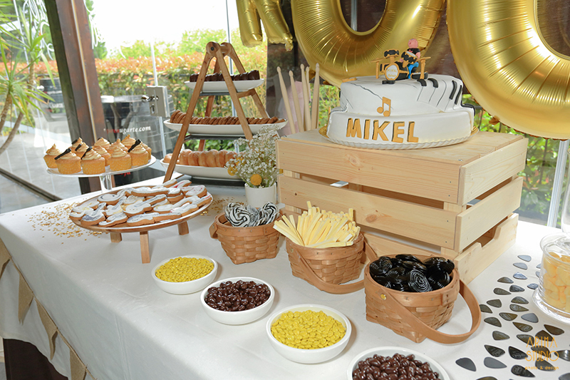 La tarta personalizada la colocamos sobre una caja de Ikea para darle altura, y con ella protagonismo en el centro de la mesa dulce... Ahí le tenéis al explorar tocando la batería... ¡Dándolo todo!