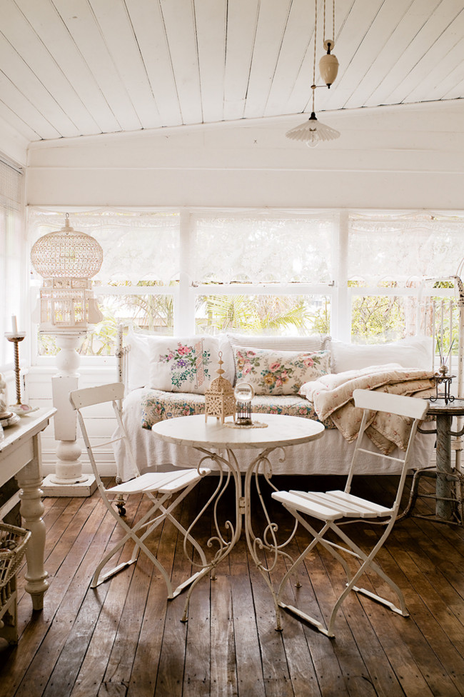 vieja cama de hierro se han utilizado para decorar la terraza acristalada.
