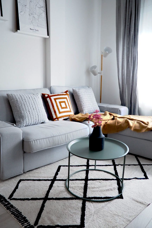 Cojín rectaculos blanco (HM Home), Plaid sofá y cama (Zara Home) Funda nórdica (HM Home), toallas (HM Home), cojines grises (nordicroom.es)