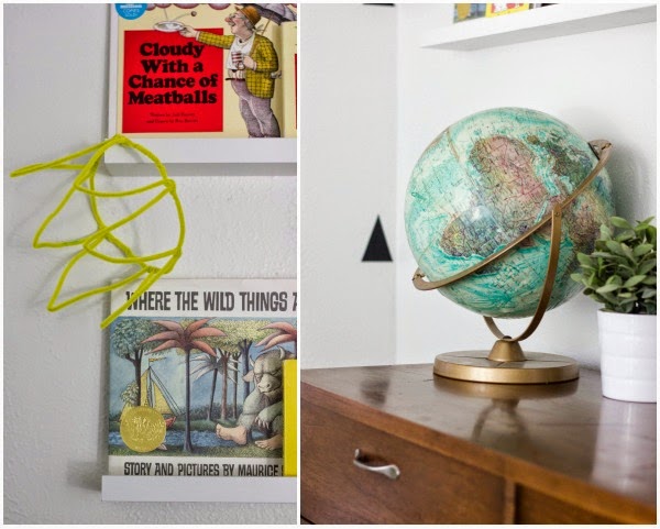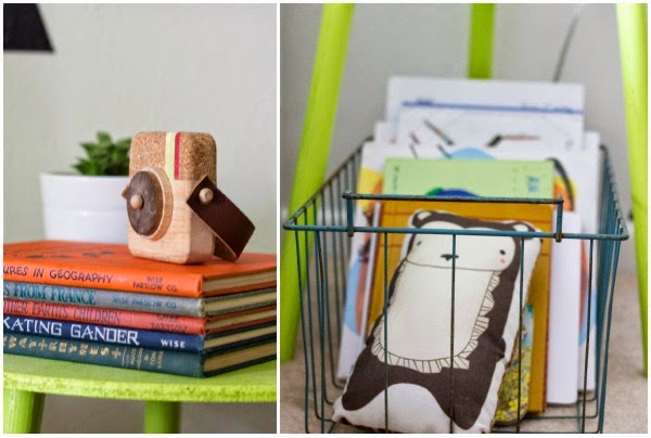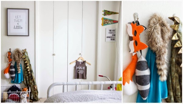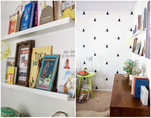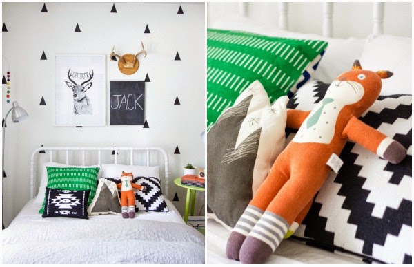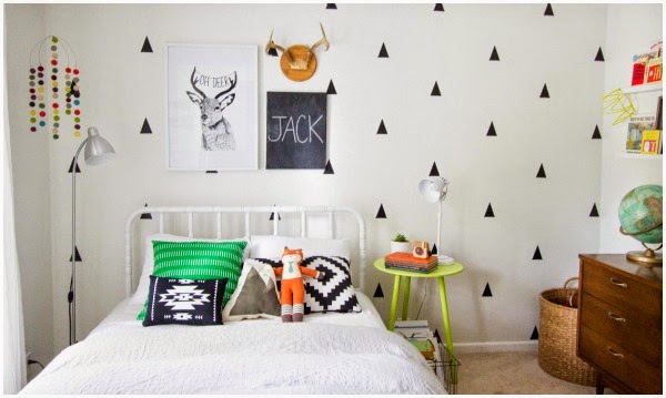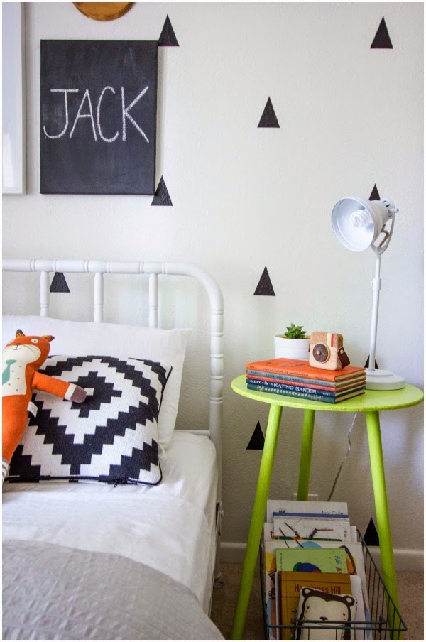 Una simple pared blanca cobra un gran protagonismo gracias a unos cuantos stickers de triángulos (los tendremos en "To The Wild"!); todos sus cuentos forman parte de la decoración mediante las ya populares baldas de ikea que permiten exponer sus portadas; unos muebles de segunda mano recuperados que siempre me parecen una opción estupenda para los cuartos infantiles (mirad esa sencilla mesilla redonda que capta todas las miradas con un toque de pintura neón), y otros tantos elementos que hacen que el cuarto de Jack sea tan especial: un rincón de disfraces que siempre es un triunfo entre los niños, cojines chulos como el de las montañas que podéis encontrar aquí, o una cámara de fotos de juguete que podéis comprar aquí, cestos metálicos donde tener organizados los cuentos o los muñecos... En definitiva; cosas sencillas, pero que bien mezcladas marcan la diferencia.