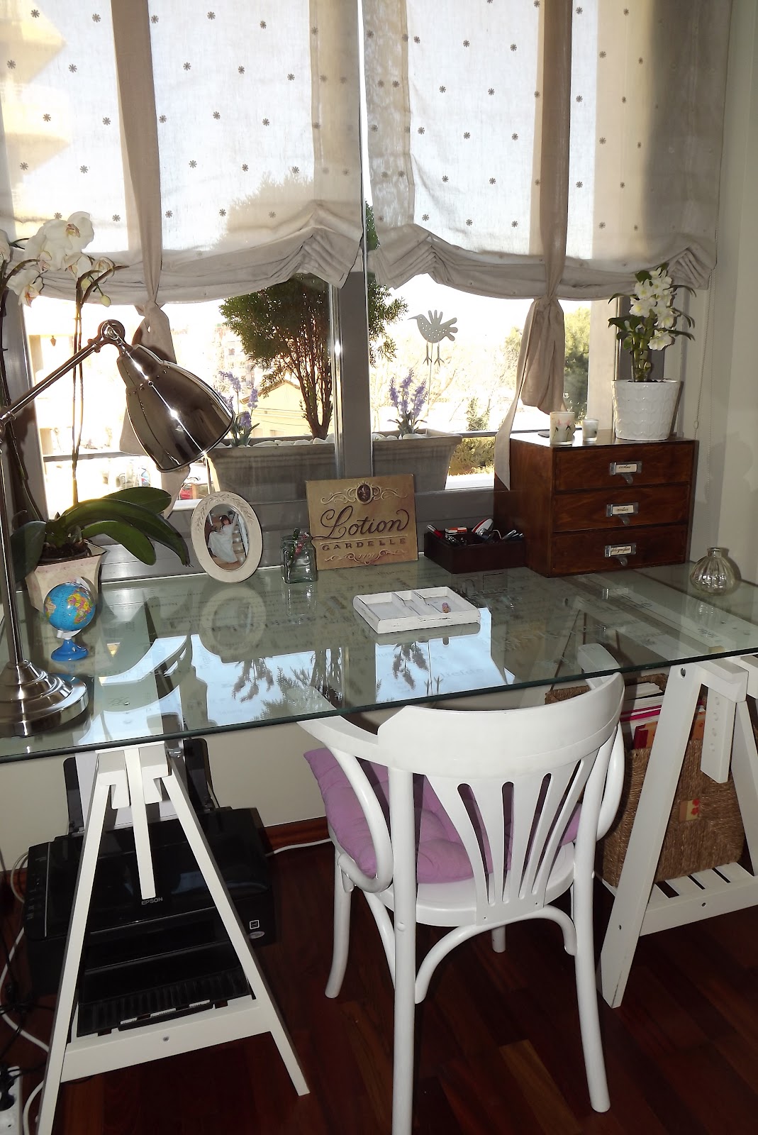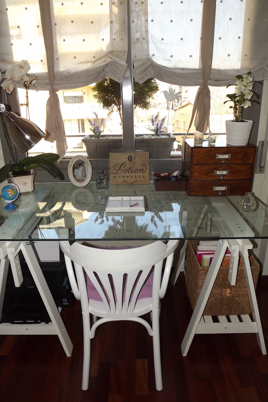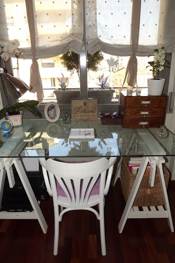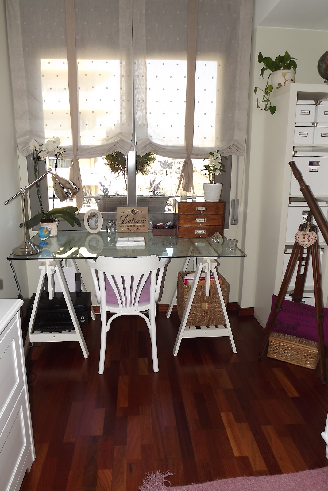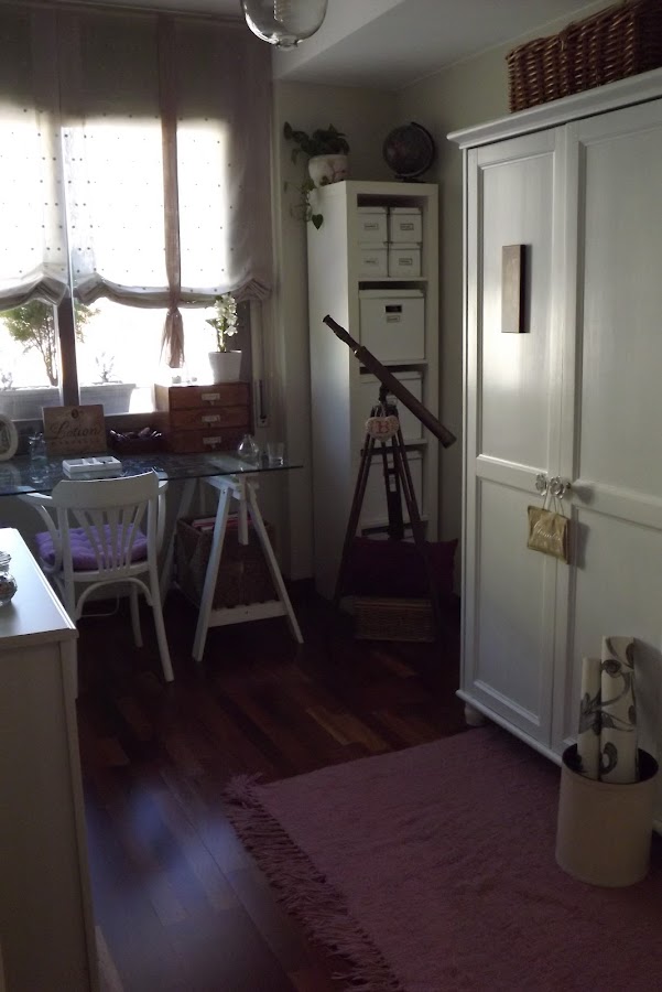 Hoy os muestro nuestro despacho,el lugar de trabajo de mi marido,el que más horas pasa allí...Siempre he pensado que es un lugar dificil de decorar,tiene que ser tranquilo,ordenado,que ya es difícil,donde encaje estilo y comodidad y por supuesto donde se vea reflejado tu estilo en conjunto con tu hogar...Todo él es made in Ikea...el caballete con el sobre de cristal,la estantería,el armario grande,la lámpara...pero con un toque de antiguedad como el telescopio y la lámpara de techo de herencia...Creo que he sabido crear un espacio armónico con los toques de blanco que tanto me gustan y donde mi marido puede decir con orgullo,este es mi lugar,mi sala de operaciones...Que tengáis un miercoles delicioso con solecito incluido,que ya tocaba..