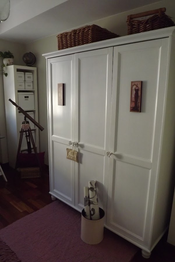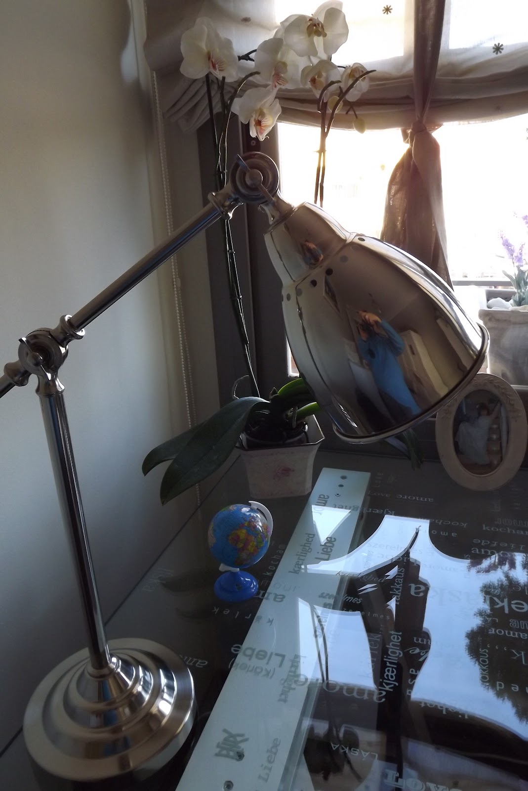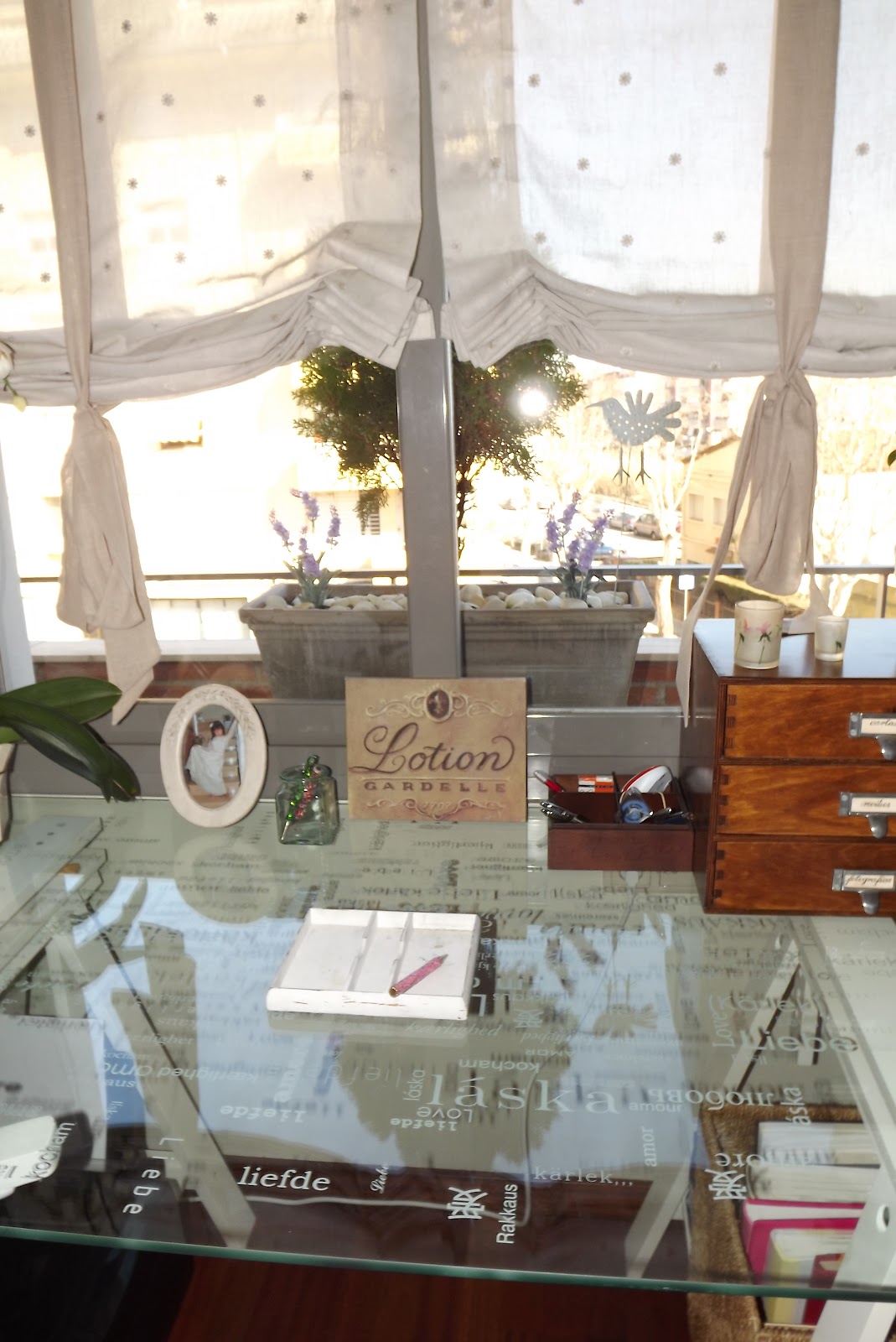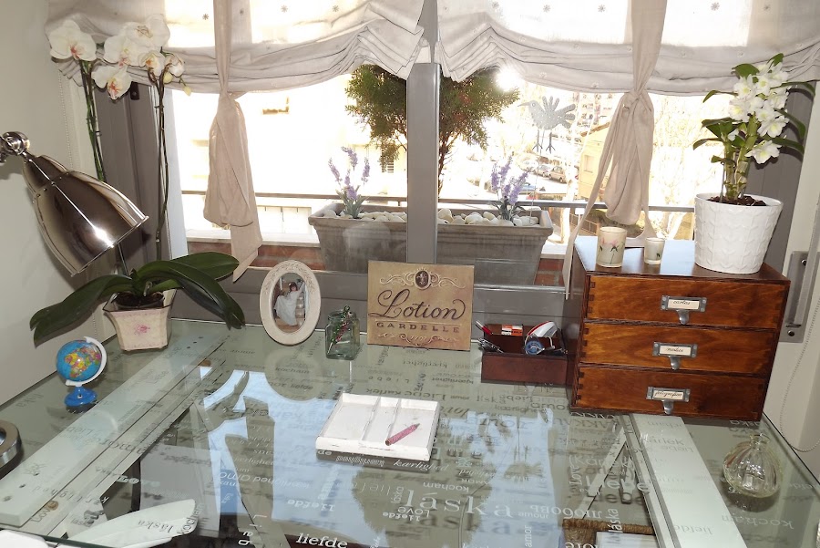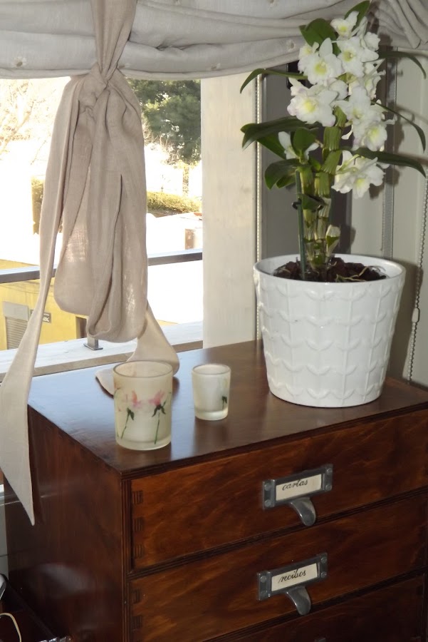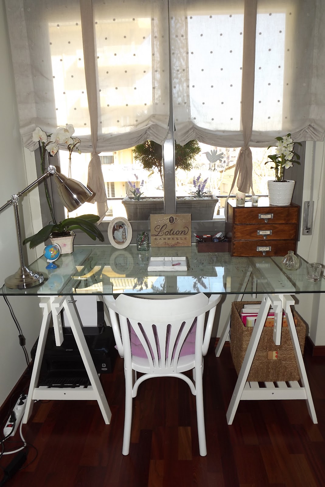 Hoy os muestro nuestro despacho,el lugar de trabajo de mi marido,el que más horas pasa allí...Siempre he pensado que es un lugar dificil de decorar,tiene que ser tranquilo,ordenado,que ya es difícil,donde encaje estilo y comodidad y por supuesto donde se vea reflejado tu estilo en conjunto con tu hogar...Todo él es made in Ikea...el caballete con el sobre de cristal,la estantería,el armario grande,la lámpara...pero con un toque de antiguedad como el telescopio y la lámpara de techo de herencia...Creo que he sabido crear un espacio armónico con los toques de blanco que tanto me gustan y donde mi marido puede decir con orgullo,este es mi lugar,mi sala de operaciones...Que tengáis un miercoles delicioso con solecito incluido,que ya tocaba..