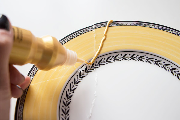 Primero unimos nuestros trozos de cerámica con el pegamento y luego embellecemos las juntas con la pintura dorada.