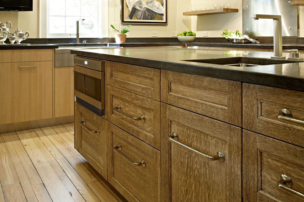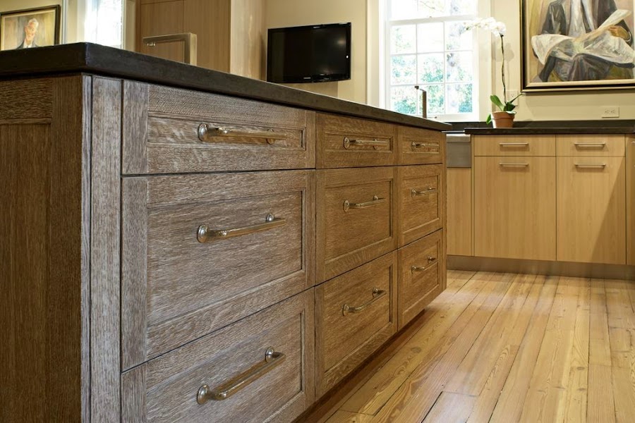 En este caso, se ha optado por una isla con frentes y puertas clásicas de madera de roble enmarcada y vetas muy pronunciadas, mientras que el resto de los muebles presentan un modelo liso más contemporáneo, con estrías mucho más suaves y rectas e incluso con tiradores de asa diferentes. La configuración angular contiene la zona de cocción y un fregadero bajo encimera con faldón debajo de la ventana y otro fregadero auxiliar en la isla.