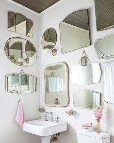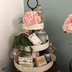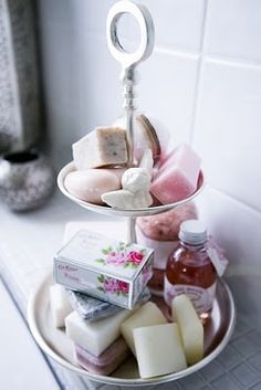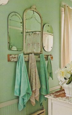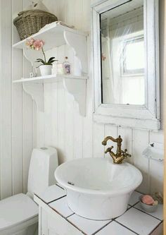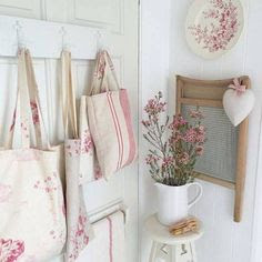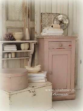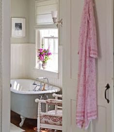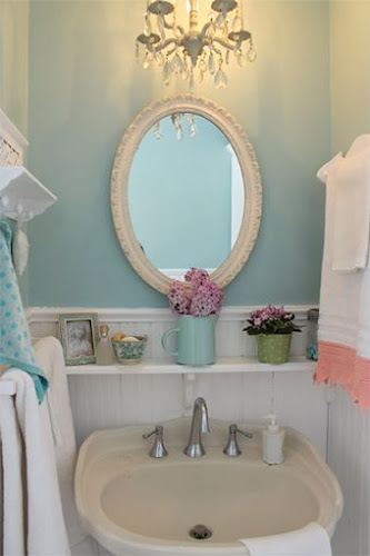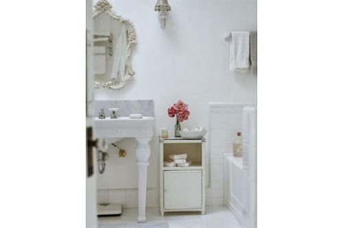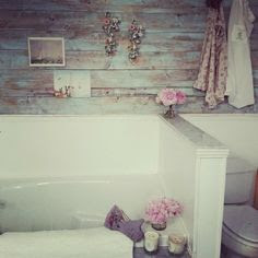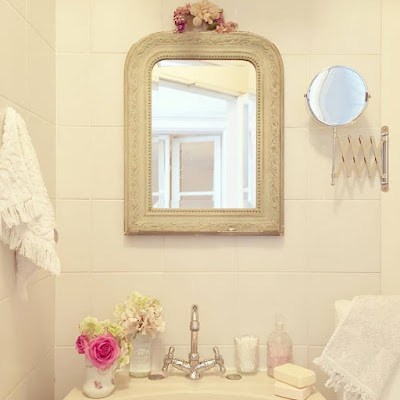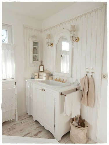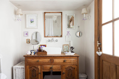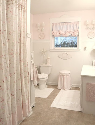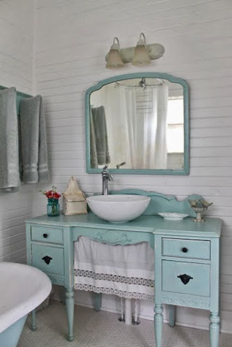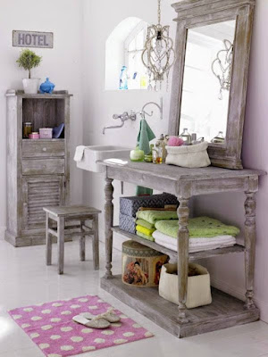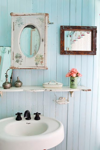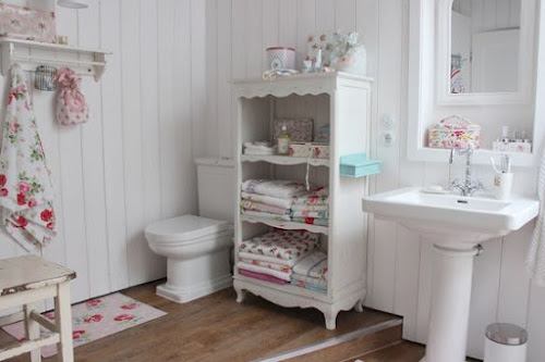 En el baño para lograr el shabby utilizamos muebles antiguos reciclados tan característicos de este estilo en tonos rosa, celeste, blanco ..muchas flores en estampados, en floreros, cajas para organiz ...